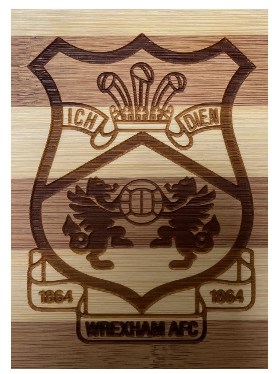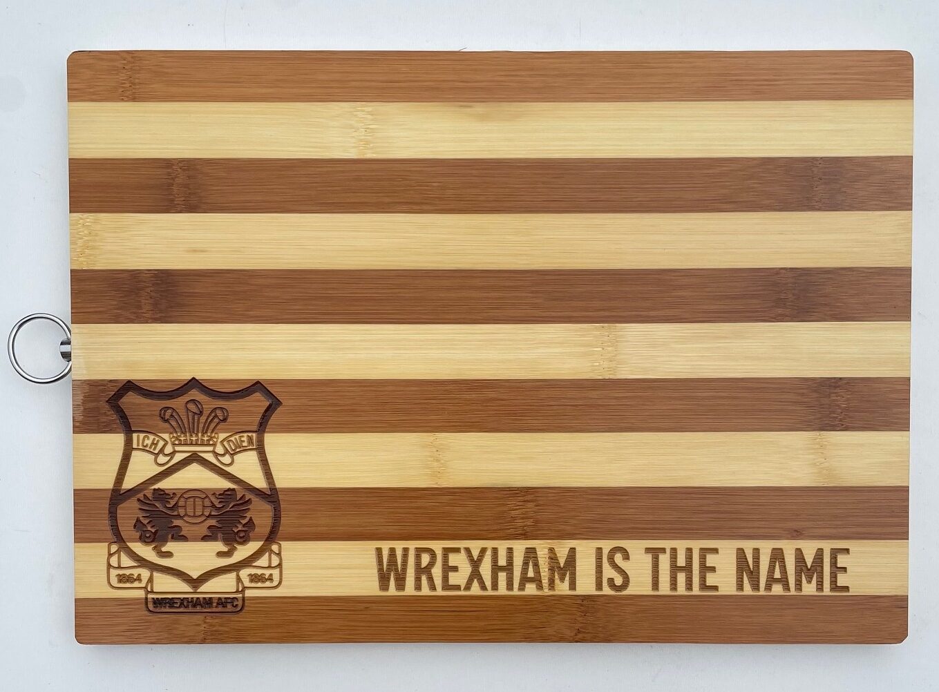 Elevate your kitchen with this officially licensed Wrexham AFC bamboo chopping board, featuring the iconic club crest beautifully engraved into its surface. Measuring 34 x 24 x 2 centimetres, this substantial board weighs 950 grams and provides ample space for all your food preparation needs. The natural bamboo construction offers both durability and style, while the personalised club crest engraving adds a touch of pride to your culinary workspace. Perfect for the devoted Wrexham supporter, this rectangular chopping board combines practicality with club loyalty. The board’s generous dimensions make it ideal for various chopping tasks, whether you’re preparing match day snacks or cooking a family meal. Manufactured in 2023 by Handy Stamps in Great Britain, this premium piece of kitchenware serves as both a functional tool and a celebration of club heritage, featuring the historic 1864 establishment date within the crest design.